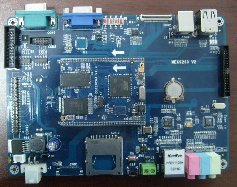 ATMEL ARM9 MEC9263開發板資源: 本開發板系統本身具有開放、集成度高、可擴展性強、低功耗等特點。已經廣泛應用于無線應用、數字家電、車載設備、通信設備、網絡終端等場合。并具有相當的價格優勢,有很好的性價比。AT9263是ATMEL公司推出的92XX系列最高型號ARM芯片,采用ARM926EJ-S內核,雖然主頻為200MHz,但是強大的2D圖形加速器使得顯示分辨率可達2048*2048完全達到高端顯示性能,更具有DSP擴展指令,JAVA硬件加速功能,內部CAN總線接口,優于三星等民用級ARM處理器,采用了最可靠的工業物理結構。