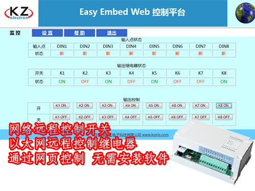 嵌入式Web服務器EA02(以下簡稱EA02),是一臺小巧而功能強大的服務器。通過以太網連接,在瀏覽器地址欄輸入地址(如“192.168.1.200”)則可遠程控制繼電器輸出及查看輸入觸點狀態,無需安裝軟件,局域網、Internet均可使用。界面優美,支持動畫、flash、音/視頻。支持二次開發,用戶可自行升級。