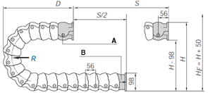 A=移動端, B=固定端 螺距: 56mm/鏈節 每米鏈節數: 18 行程: S 拖鏈長度s = S/2 + K 架空長度架空長度取決于額外負載 X軸:架空長度(米)FLB/FLG Y軸額外負載(千克/米) 下限:行程S(米) FLB = 帶準許凹陷的架空 FLG = 上層平直的架空 參考范例A: 額外負載 = 4,0[千克/米] 架空長度FLB = 1,5米 行程 = 3,0米