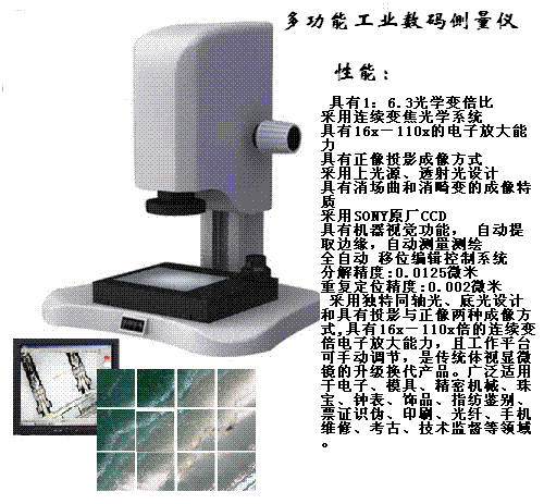 是以現代光學為基礎,運用數字圖像處理、計算機通信和機器視覺系統為一體的現代視覺系統的綜合運用。視覺測量 視覺檢測 視覺定位 視覺分析 集合了數字科技成果與計算機屏幕測量技術的數碼投影測量系統,它應用了獨有的雙向同步倍率校正技術(專利),采用獨特同軸光、底光、側光設計和具有投影與正像兩種成像方式,測量精度為±2um,分辨率0.001mm.能夠有效的解決了電子產品的誤差和屏幕的局限和滿足各種倍率的要求。產品是針對精密電子產品檢測制造業日益精湛的加工工藝所帶來的精確需求開發而成。MTC280系列機器視覺系統是機器視覺檢測、測量. 識別、定位.與嵌入式ARM等高技術軟件開發,目前已廣泛應用于裝備制造、工業部件檢測、包裝檢測、印刷檢測、工業測量、劃痕(工損檢測)設備運動識別、定位等領域。提供實用、先進的解決方案服務于相關行業的開拓者。“技術創新與企業實際需求相結合”是產品開發的主導思想,也是我們提供產品和服務的指導思想。 MTC280系列機器視覺系統為解決現代工業產品生產過程中涉及的各種各樣的檢查、測量和識別、定位等問題推出的一套機器視覺系統解決方案。 適用于大批量生產過程中的質量檢查,如:零件裝配完整性,裝配尺寸精度,零件加工精度,位置/角度測量,零件識別,特性/字符識別等。 應用行業:汽車,制藥,電子與電氣,制造,包裝/食品/飲料,醫學等。如對汽車儀表盤加工精度的檢查,高速貼片機上對電子元件的快速定位,對管腳數目的檢查,對IC表面印字符的辨識,膠囊生產中對膠囊壁厚和外觀缺陷的檢查,軸承生產中對滾珠數量和破損情況的檢查,食品包裝上面對生產日期的辨識,對標簽貼放位置的檢查。二、視覺系統特性: 1、 獨立的高速處理器,保障在線檢測速度要求 2、 嵌入式軟、硬件結構、保證系統高穩定性和可靠性 3、能方便的與生產線設備連接/應用 4、 系統操作簡單、方便5、 提供多種視頻圖像輸入輸出、I/O控制、通訊等接口 6、 豐富的TCP/IP控制命令 7. 擁有光學強大的檢測功能 強大的信息采集和信息共享功能 8.尺寸測量.CNC走位自動測量 9.自動學習批量測量檢測定位等.10.CNC掃描批量測量檢測定位等11.自動對焦輔助測高,12影像地圖全屏牽引,13.鷹眼縮放精確回位,14SPC報告超標報警; CAD逆向測繪15. CNC快速測量檢測定位等,16.空間坐標旋轉,17.內置 SPC 功能,18實時修正誤差 ,19定位識別 /信息采集對比等功能20.統計分析.21.信息采集導入CAD導出軌跡功能,測精度為±2um。信息采集1秒/4-10次.誤查精度±2um,取像時間/運算時間250-100毫秒/視野250FOV/秒