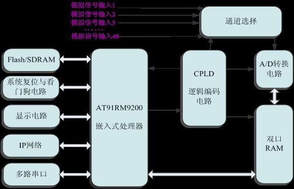 在系統運行過程中,CPU發控制信號給CPLD,利用CPLD編程的靈活性來控制48路ADC的啟動和停止,即達到動態地選擇采樣通道地目的。ADC轉換電路將采樣信號由FIFO緩沖后送入ARM處理器,進行數據處理并將結果傳輸到上位機。