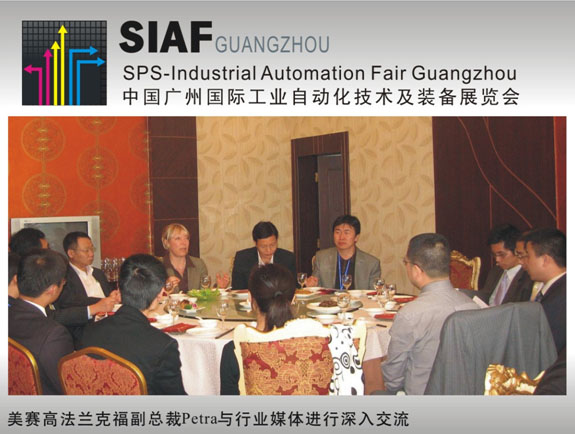 11月5日,SIAF GUANGZHOU 的主承辦單位--中國對外貿易廣州展覽公司、廣州富洋展覽有限公司、廣州光亞法蘭克福展覽有限公司以及德國美賽高法蘭克福展覽有限公司在上海召開了媒體見面會,邀請了國內外的自動化行業媒體出席。美賽高法蘭克福展覽公司副總裁Petra Haarburger女士在會上做了發言,“SIAF2010中國廣州國際工業自動化技術及裝備展覽會”在自動化領域內已經引起了巨大反響,眾多國際知名品牌紛紛積極報名參與此次盛會,主辦各方都對SIAF2010的前景充滿了信心和期待。