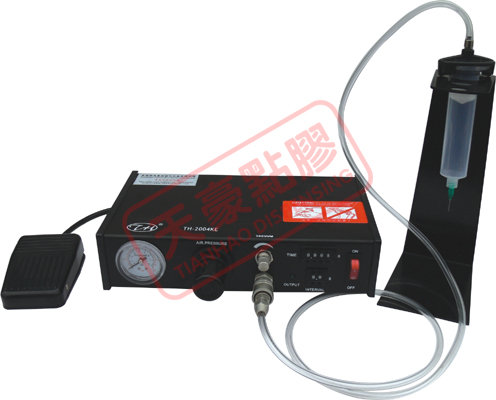TH-2004KE型 天豪數碼循環點膠機             技術參數: 出膠時間: 0.007S-9.999S 循環(間斷)時間: 0.1S-9.9S 輸入氣壓: 1bar–7bar 輸出氣壓: 0.1bar–7bar 重復精度: 0.0005S 最小滴點量: 0.005ml 工作速度: > 600次/分 輸入電壓: 110V/220V±10% 50Hz 消耗功率: < 15W 重 量: < 4Kg 尺 寸: 70×210×256mm   特點: 1.本機適合點滴量精度要求較高的產品或產品大批量生產 2.機器設有自動循環功能有效減輕勞動強度,提高產量 3.采用數字電路定時定量控制技術,數碼撥盤設定出膠時間 4.配備真空回吸裝置以消除液體滴漏 5.腳踏開關/指環開關/感應開關可供選擇