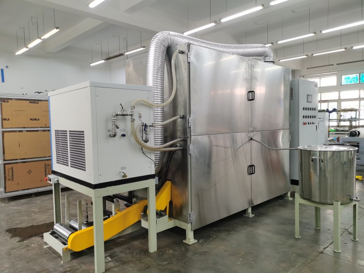 以煤油為助劑生產加工的產品,烘干助劑產生的油氣,對空氣排放,既對環境造成污染又增加了企業成本。我公司聯合生料帶企業,反復測試,特開發此設備,對煤油助劑進行回收和重復利用。 為了響應環保要求,本公司研制成功了高效的煤油回收系統,解決了生料帶行業煤油自然排放,污染空氣的難題。本系統集機電一體化等高難技術,使回收率和空間率達到提高。 產品特點: 1.采用全新的變頻控制技術,整機平穩運行功耗更低; 2.整機一體式設計,節省空間,安裝與操作更加簡單; 3.采用我司專利回收方案(專利號:ZL 2016 2 0059331.7), 煤油回收效率更高; 4.采用接觸式傳導加熱技術,十到二十分鐘即可達到生產溫度; 5.每套加熱滾筒獨立控制啟停和溫度,提高設備穩定性; 6.采用先進的收卷冷凝降溫技術,防止收卷后溫度過高而粘連; 7.加熱倉體加裝防爆裝置,確保整機安全運行; 8.三級過濾體系,使VOC數值達到環保排放要求;收集煤油清潔無雜質可循環用于生產; 9.可根據料帶寬度定制雙卷模式,進一步提高生產效率; 10.完善的出廠測試程序,每臺機器進行實際脫油操作,確保達到客戶要求; 11.人性化操作設置,一定程度實現自動化控制,省時省力。 主要用途: 1.生料帶生產加工企業 2.以煤油為助劑及其他生產加工企業 規格參數: 型號 | RX-HS-VO1 | 生產效率 | 約50KG/小時 | 電源 | 三相380V40KW | 運行功率 | 約10KW | 機器重量 | 1500KG | 備注:運行功率因客戶產品厚薄的不同略有浮動。 |