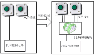 雙手同步控制,必須兩個按鈕同時按下機床才動作,超過同步控制時間機床則不動作;