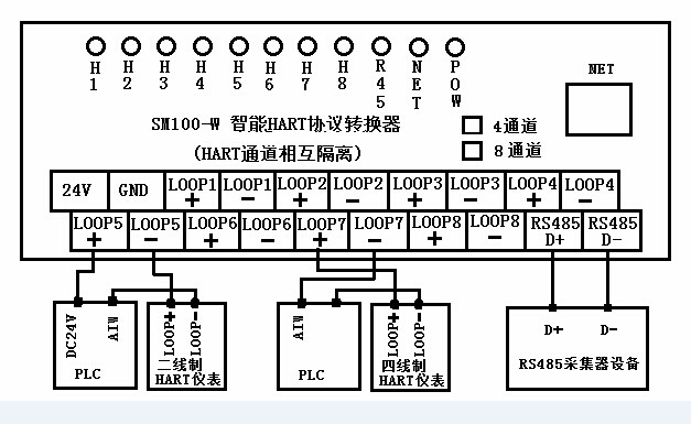 一、產品特點: ● 配有1個標準的RS485通訊接口,可以進行參數配置、更改通訊波特率及奇偶校驗位。 ● 配有1個標準的以太網通訊接口。 ● 采用工業通用的模塊外殼,便于安裝及調試。 ● 配有專用配置軟件,可以對SM100-W系列智能轉換器進行參數配置,并且通過智能轉換器,可以與HART協議智能儀表進行數據通訊。 ● 支持標準的MODBUS_RTU及MODBUS_TCP協議。 ● 支持同時連接多臺HART協議智能儀表。 ● HART每個通道相互隔離, 不影響儀表電流輸出 ● 支持多種特殊HART協議智能儀表,并能自定義讀取特殊HART儀表的指令。 ● 數據更新時間,1臺0.8秒,如果接8臺6.4S全部更一次數據。 ● 安裝方式:可以標準軌道安裝,也可固定安裝 二、產品參數: ● 電源輸入電壓:DC 12~24V,電源的波紋不得大于200mA,電流需提供100mA。 ● 物理尺寸:長145 mm × 寬90 mm × 高73 mm。 ● 工作環境溫度:-20℃ ~ +80℃。 ● 相對濕度:10% ~ 80%。 三、接線圖