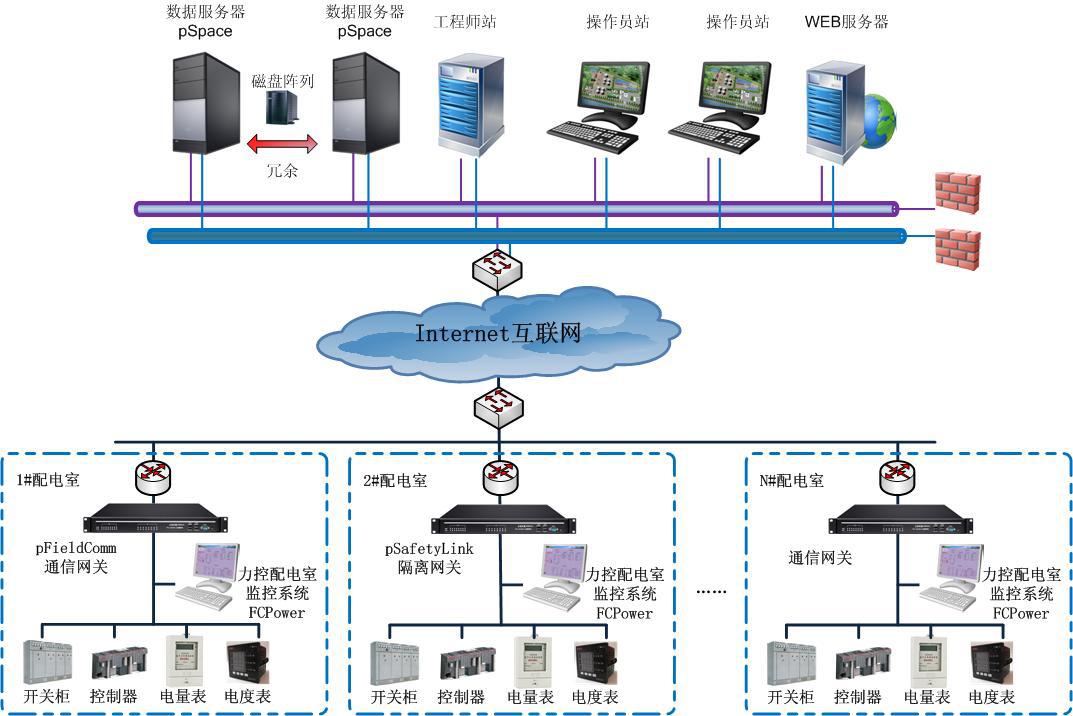 力控FCPower專業電力電氣監控組態軟件是完美的結合了通用組態軟件和電力專業技術,采用最新IT技術開發的專業電力電氣自動化組態軟件。該產品適用于企業供配電自動化、集控站自動化、樓宇配電自動化、變電站綜合自動化、電廠電氣監控(ECS)、水電站綜合自動化等系統,可以廣泛應用于工業企業各電壓等級的變配電室和市政建設、智能大廈、水利、環保、港口等領域的智能變配電系統,并且可以和GIS(地理信息系統)/MIS(電力企業管理信息系統)/CIS(用戶信息系統)等其他系統進行完美的結合,共同為企業打造一個堅強的綜合智能管理平臺。 FCPower產品的應用架構非常靈活,支持可擴展的分層分布式應用架構。FCPower可以與力控其他產品如數據庫產品,網關產品等配合使用,將多個配電室的電力數據進行匯總,形成廠級或集團級的集中的電力信息監控系統。要對配電室進行擴展,只需增加新的服務器及軟件,就可以將新站點的數據方便的集成到現有系統中。典型的部署架構如下圖: