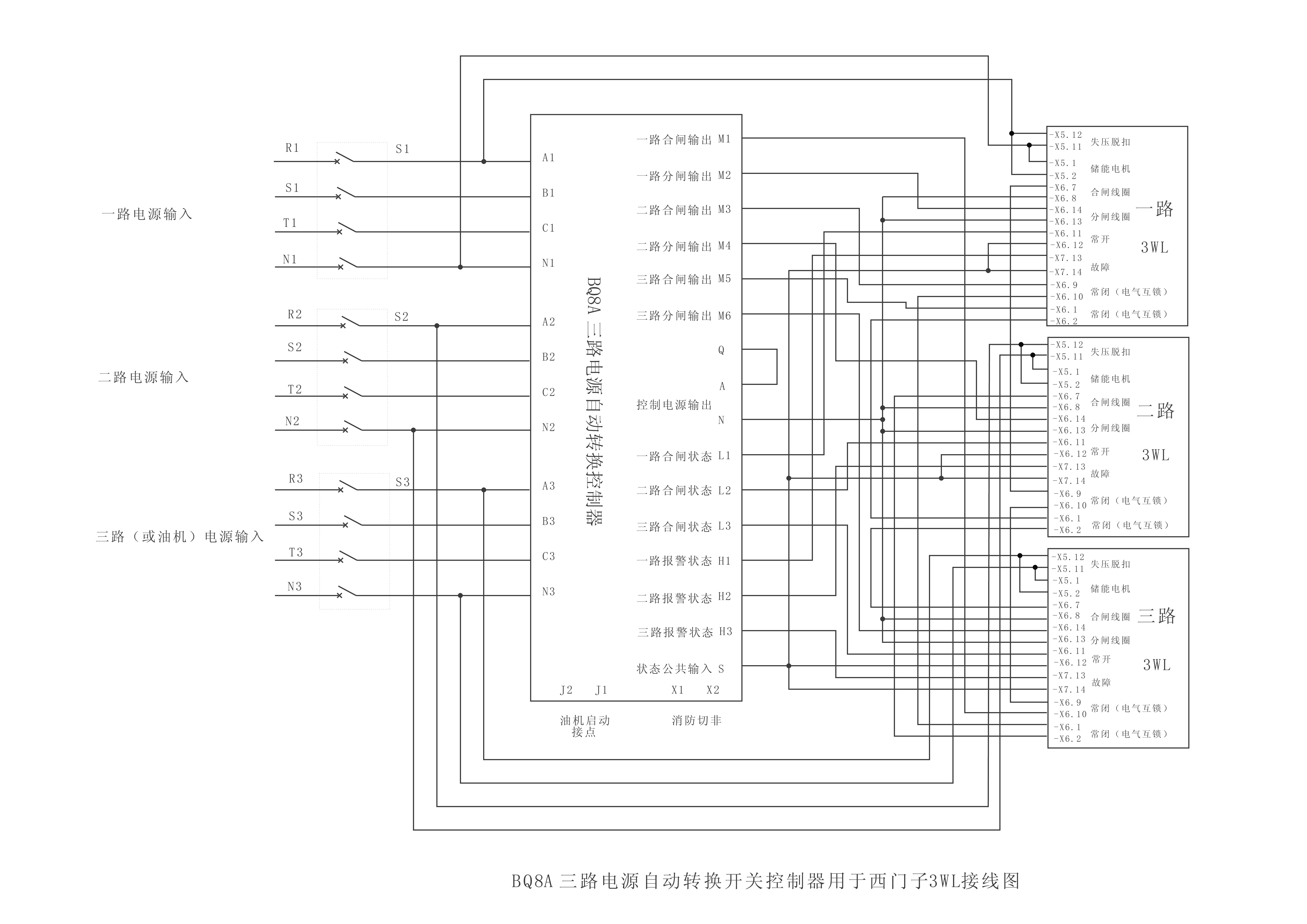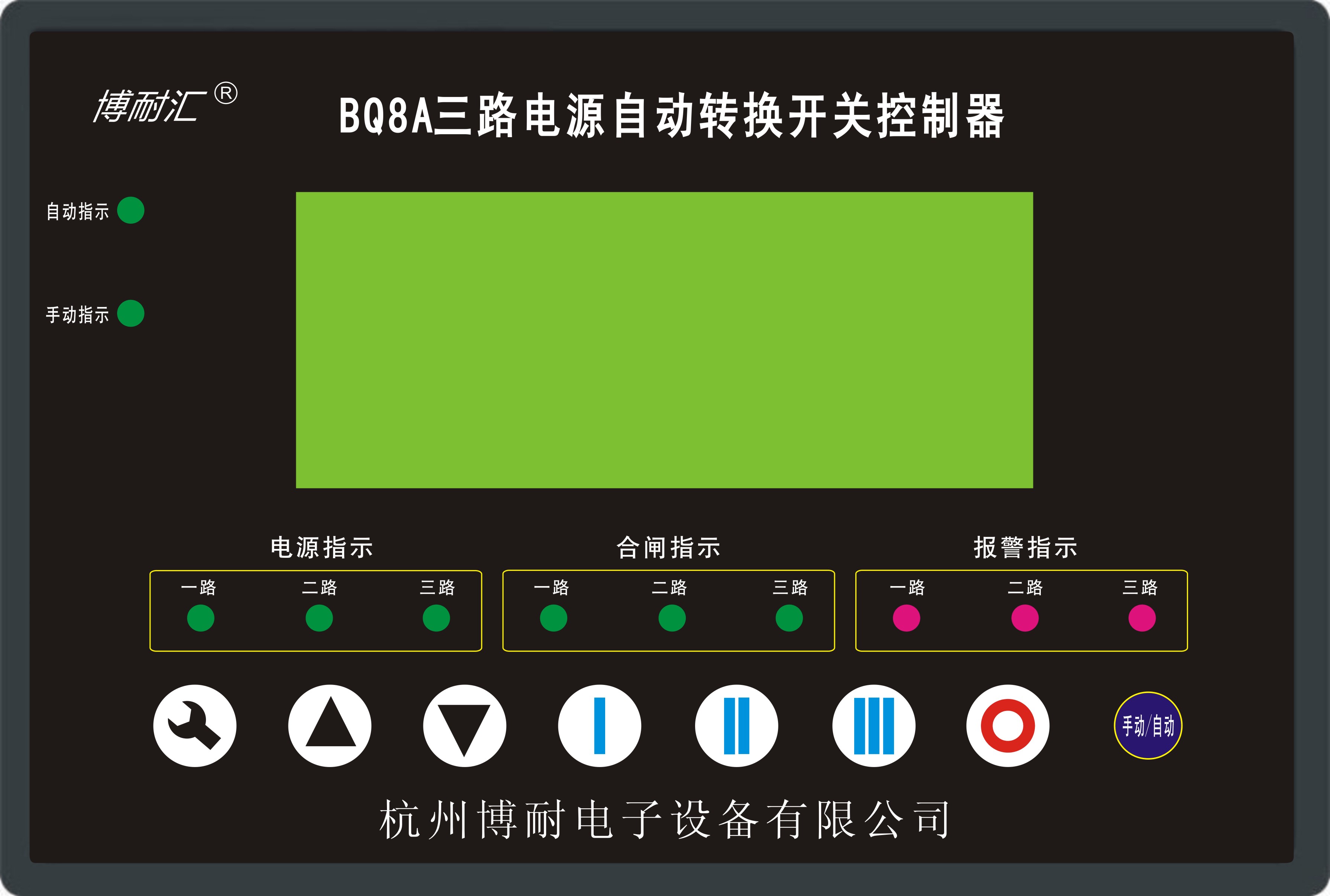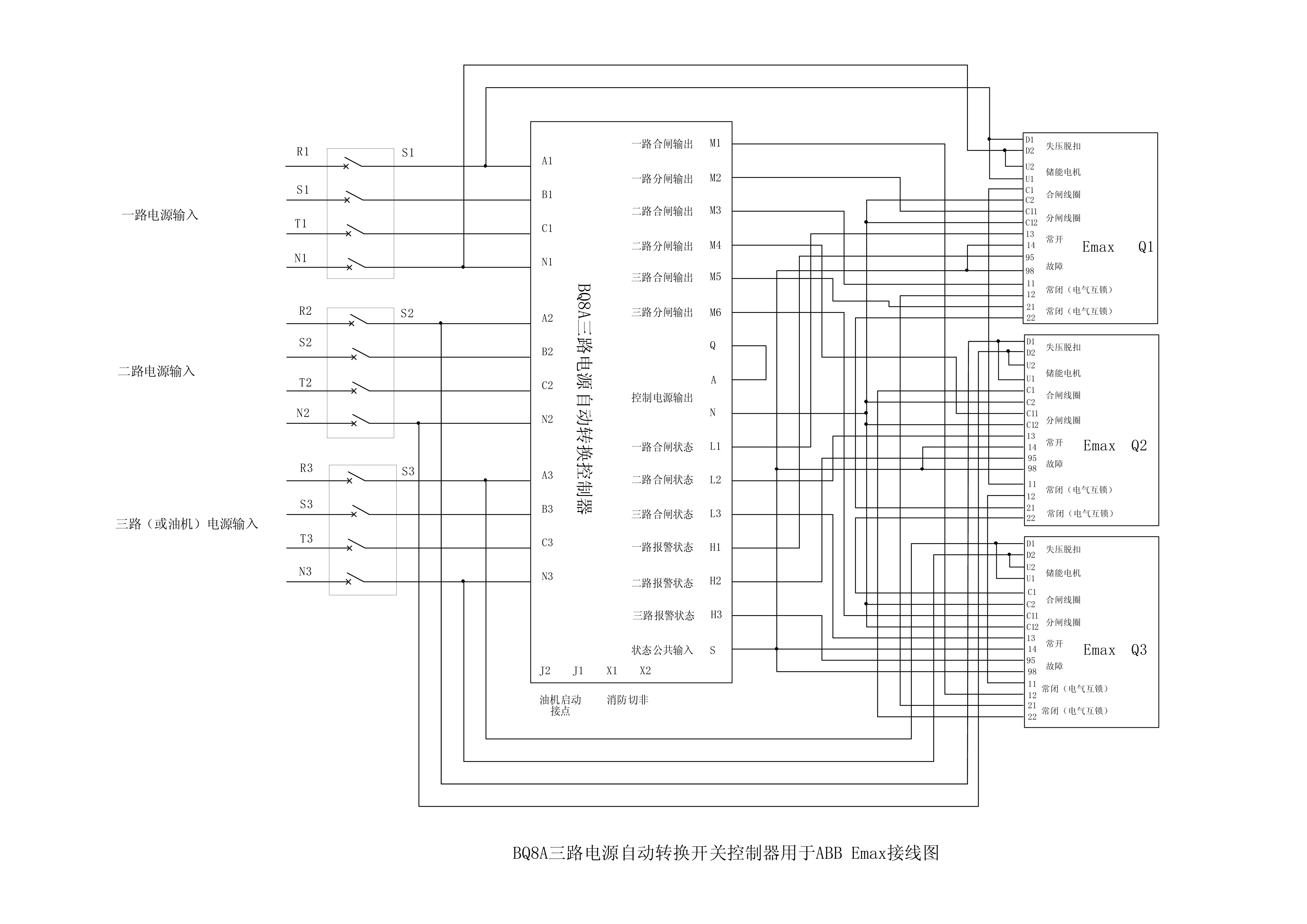 BQ8A三路(lu)(lu)電(dian)(dian)源(yuan)自(zi)動轉換(huan)開關控(kong)制器是一種(zhong)自(zi)動化測量、大屏(ping)幕LCD顯示為一體的智能(neng)三路(lu)(lu)電(dian)(dian)源(yuan)切換(huan)系統。是三路(lu)(lu)電(dian)(dian)源(yuan)自(zi)動切換(huan)的理想產品,在與低(di)壓(ya)空氣(qi)斷路(lu)(lu)器配(pei)套使用(yong)后,特別適合于三路(lu)(lu)低(di)壓(ya)進線側的自(zi)動轉換(huan)和保(bao)護。 產品具(ju)有結構緊(jin)湊(cou)、電路(lu)先進、接線簡單,可(ke)(ke)靠性高(gao),操作機構不管是(shi)塑殼(ke)斷(duan)路(lu)器,還是(shi)框架斷(duan)路(lu)器,還是(shi)CD2的(de)電操,都可(ke)(ke)與之配套。可(ke)(ke)廣泛應用于電力、石油(you)、化工、煤(mei)炭、冶金(jin)、鐵道、市政(zheng)、智能大廈等行業、部(bu)門的(de)電氣裝置、自動控(kong)制以及(ji)調試系統。 產品(pin)特點(dian) BQ8A自(zi)動(dong)轉換開關控(kong)制器(qi)(qi)的執行部(bu)件可(ke)以是框架式空氣斷路(lu)器(qi)(qi)也可(ke)以是塑殼斷路(lu)器(qi)(qi),三(san)臺斷路(lu)器(qi)(qi)不(bu)用加裝適配(pei)器(qi)(qi),也可(ke)以不(bu)需要(yao)(yao)欠(qian)壓脫扣(kou)器(qi)(qi),控(kong)制器(qi)(qi)不(bu)需要(yao)(yao)外接(jie)直(zhi)流電源,直(zhi)接(jie)對三(san)路(lu)供電狀態進行檢(jian)測,自(zi)動(dong)控(kong)制完成三(san)路(lu)電源的自(zi)動(dong)轉換。 技(ji)術特性 1.適用(yong)于三(san)路(lu)(lu)市電、兩(liang)(liang)路(lu)(lu)市電一路(lu)(lu)發電機或一路(lu)(lu)市電兩(liang)(liang)路(lu)(lu)發電機的(de)(de)三(san)路(lu)(lu)電源的(de)(de)自動轉換(huan)控制; 2.時刻監視三路三相電壓(ya)(ya)(ya),對出(chu)現的(de)電壓(ya)(ya)(ya)異常(如失壓(ya)(ya)(ya)、過壓(ya)(ya)(ya)、欠壓(ya)(ya)(ya)、缺相)做出(chu)準確的(de)判斷并輸出(chu)控制開(kai)關量(liang); 3.內(nei)部設有(you)控制(zhi)電(dian)(dian)源切換電(dian)(dian)路(lu),充(chong)分考(kao)慮(lv)了在各種操作機構的應用(如三個接觸器(qi),電(dian)(dian)動空開,框架斷路(lu)器(qi),CD2電(dian)(dian)操塑(su)殼斷路(lu)器(qi)等),還可作為(wei)ATS以及三選一(yi)工作電(dian)(dian)源使用;(三路(lu)只要其(qi)中一(yi)路(lu)電(dian)(dian)源正常,即有(you)控制(zhi)電(dian)(dian)源輸出(chu))。 4.設有自(zi)動(dong)(dong)/手動(dong)(dong)狀(zhuang)態切換(huan)功能,在手動(dong)(dong)方(fang)式下,可按(an)手動(dong)(dong)鍵實現開關分合閘(zha);自(zi)動(dong)(dong)狀(zhuang)態下,任何一路(lu)(lu)出(chu)現電壓異常時,開關自(zi)動(dong)(dong)切換(huan)到另一路(lu)(lu),在一路(lu)(lu)和(he)二路(lu)(lu)都(dou)異常時,自(zi)動(dong)(dong)啟動(dong)(dong)油(you)機發(fa)電,轉換(huan)到三路(lu)(lu)供(gong)電; 5.運行模式可設定為:自(zi)投自(zi)復(fu)(含一路(lu)(lu)優(you)先(xian)、二路(lu)(lu)優(you)先(xian))或自(zi)投不(bu)自(zi)復(fu):無優(you)先(xian)(互為備用); 6.數字顯示(shi)三路相電壓及線(xian)電壓及工作狀(zhuang)(zhuang)態,LED同時顯示(shi)三路合(he)閘(zha)及工作狀(zhuang)(zhuang)態; 7.可在(zai)控制器上更改(gai)設置參數(shu)(shu),均(jun)采用數(shu)(shu)字化調(diao)整(連(lian)續可調(diao));同時(shi)記憶在(zai)內部FLASH 存(cun)儲(chu)器內,在(zai)系統(tong)掉(diao)電時(shi)也不會丟(diu)失; 8.設有(you)電(dian)氣雙重聯鎖功能,始終保持只(zhi)有(you)其中的一路合閘; 9.具有自動啟動油(you)機功能(neng);控制器不(bu)需(xu)要外接直流供電電源,簡(jian)單方便; 10.三(san)路N線分離設計(ji); 11.具有(you)消(xiao)防(fang)切非(強(qiang)制分閘(zha))功能,以滿足緊急情(qing)況下(xia)的分閘(zha)。 12.具有極(ji)強的(de)抗電磁干擾能力,適合在(zai)強電磁干擾的(de)復雜(za)環境中使用; 13.控制(zhi)器可與任(ren)何低壓空氣斷(duan)路器及塑(su)殼斷(duan)路器配套,如DW45、DW17、DW15、ABB Emax、MT、3WL等。 14.模(mo)塊化結構(gou)設計,阻燃(ran)ABS塑(su)料外殼(ke),嵌入式安(an)(an)裝方(fang)(fang)式,插(cha)拔(ba)式接線端子,結構(gou)緊湊,安(an)(an)裝維(wei)護十分(fen)方(fang)(fang)便(bian)。 工作條件 1.電源: 交流輸入(ru):取自三路(lu)電(dian)(dian)(dian)源(yuan)中的其(qi)中一(yi)路(lu)A、N相(xiang)電(dian)(dian)(dian)壓,只要其(qi)中任何(he)一(yi)路(lu)有(you)電(dian)(dian)(dian),即可工作(zuo),單相(xiang)電(dian)(dian)(dian)壓>170V。(該系(xi)統要求接N) 交流(liu)輸入電壓范圍:0-279V(單相)╱0-482V(三相)50Hz 輸(shu)入(ru)三相電流(liu):0-1A(額定) 輸(shu)入(ru)功率:≤5W 2.繼電(dian)器輸出容量:5A 220VAC 工作原理 A1,B1,C1,N1:接一路電源(為市電) A2,B2,C2,N2:接二路電(dian)(dian)源(yuan)(默認市(shi)電(dian)(dian),也可為發電(dian)(dian)機) A3,B3,C3,N3:接三路(lu)電源(發(fa)電機) A、N:控制器(qi)輸(shu)出電(dian)(dian)源(yuan),以(yi)上三路電(dian)(dian)源(yuan)只要任何一(yi)路有電(dian)(dian)源(yuan)輸(shu)入,A、N就有AC220V電(dian)(dian)源(yuan)輸(shu)出, A為相線,N為零線 Q:控制器M1、M2、M3、M4、M5、M6內部無源公共接點,一般接A M1:一路合閘輸出 M2:一路分閘輸出(chu) M3:二路合閘(zha)輸出 M4:二路(lu)分閘輸出 M5:三路合閘輸出 M6:三路分閘輸(shu)出(chu) S:一二三路斷(duan)路器輔助及報警(jing)公共接點 L1:控制器(qi)一路合閘指示,接(jie)一路斷路器(qi)輔助常開 L2:控制器(qi)二(er)路(lu)(lu)合閘指示(shi),接二(er)路(lu)(lu)斷(duan)路(lu)(lu)器(qi)輔助(zhu)常開(kai) L3:控(kong)制器(qi)三路合(he)閘指示,接三路斷路器(qi)輔助常開 H1:控(kong)制(zhi)器一(yi)(yi)路(lu)報(bao)警(jing)指示(shi),接一(yi)(yi)路(lu)斷路(lu)器報(ba