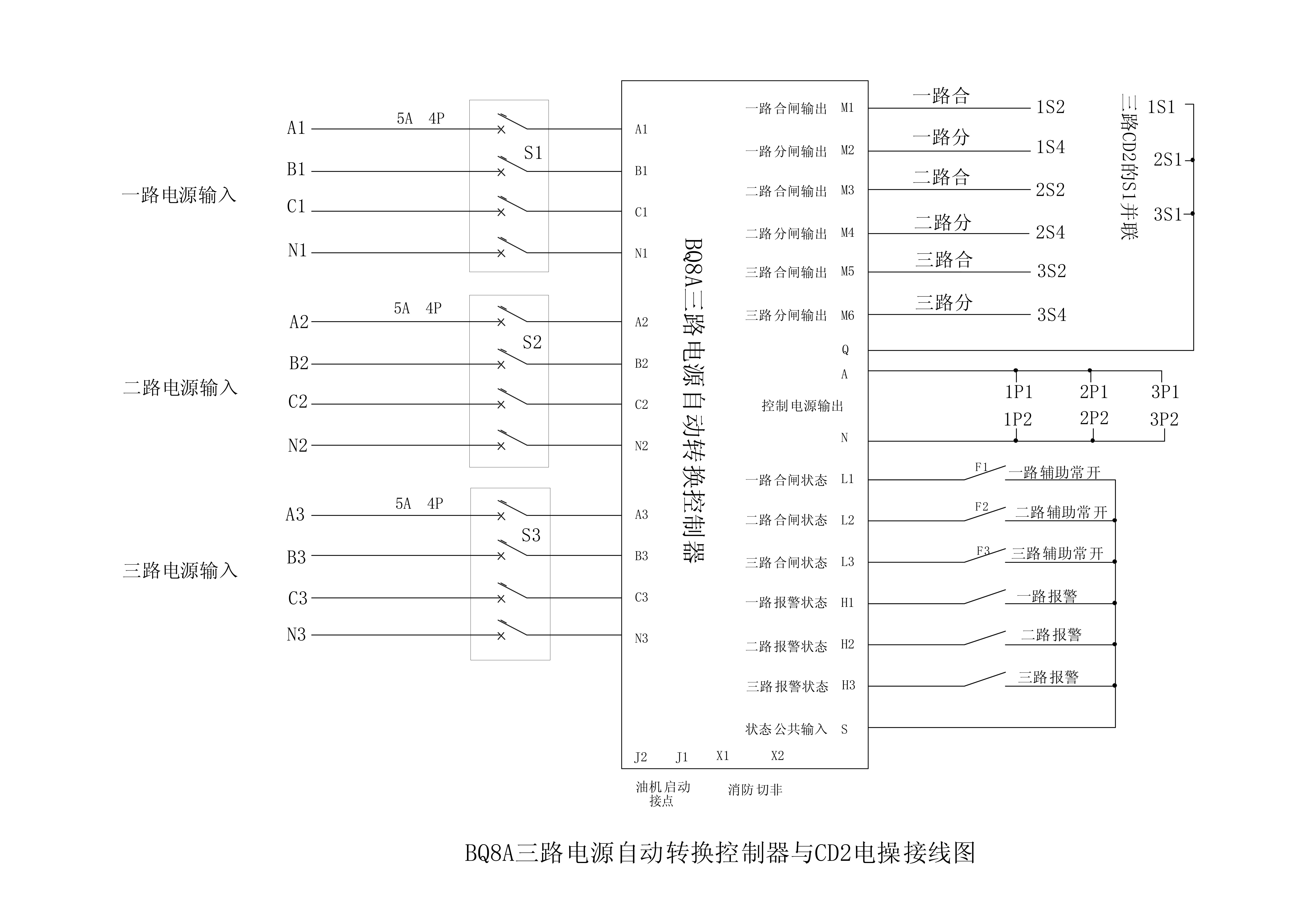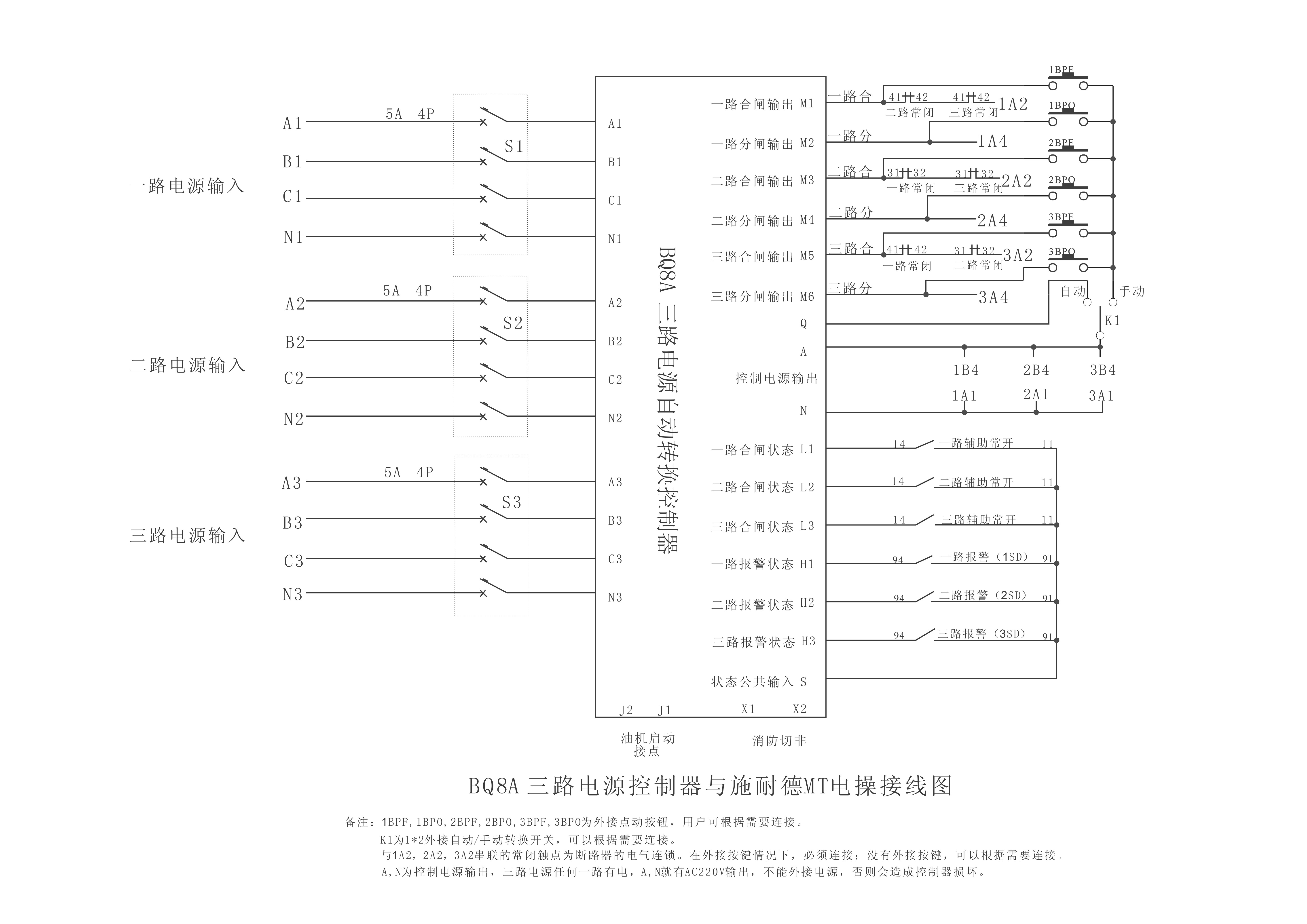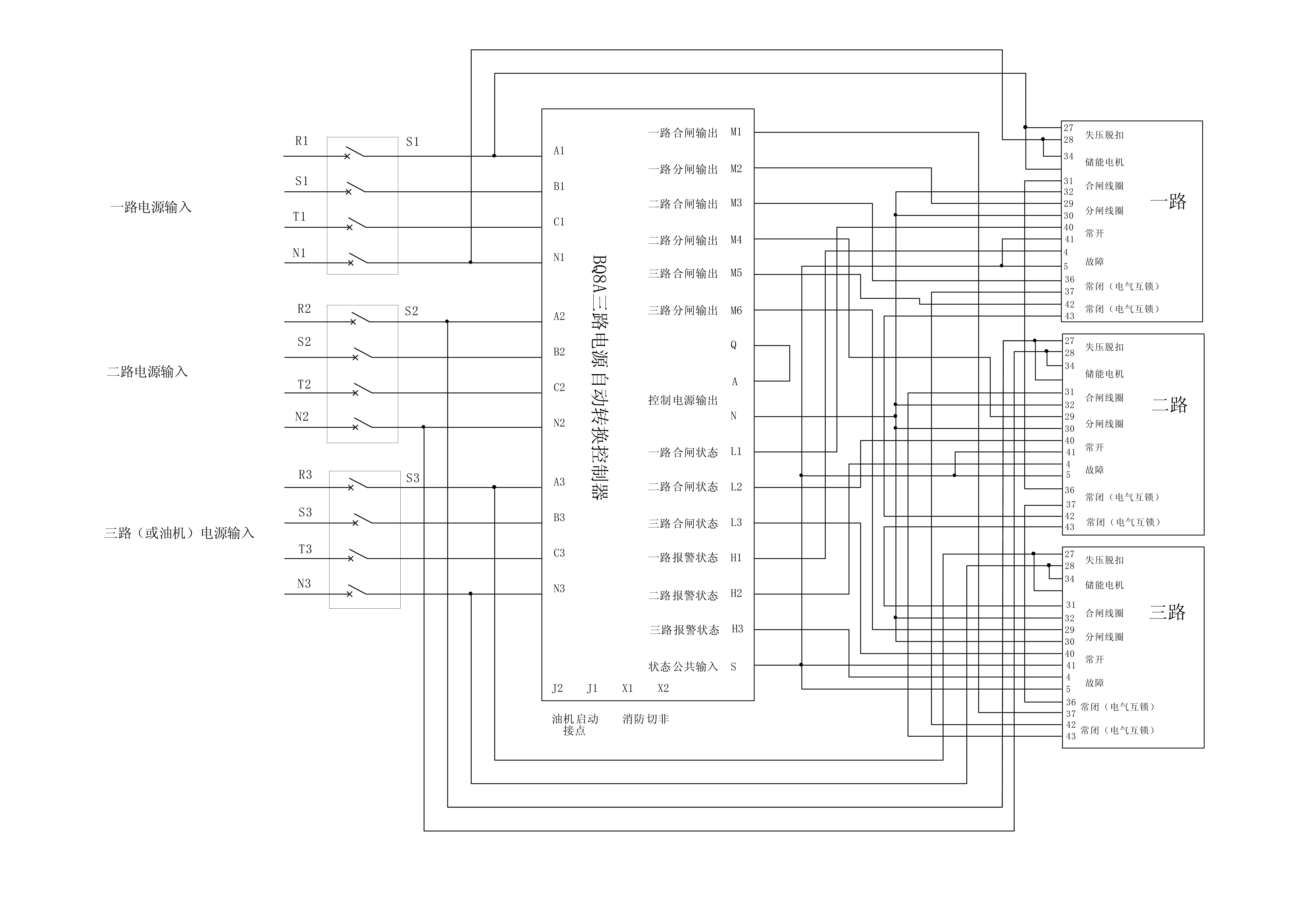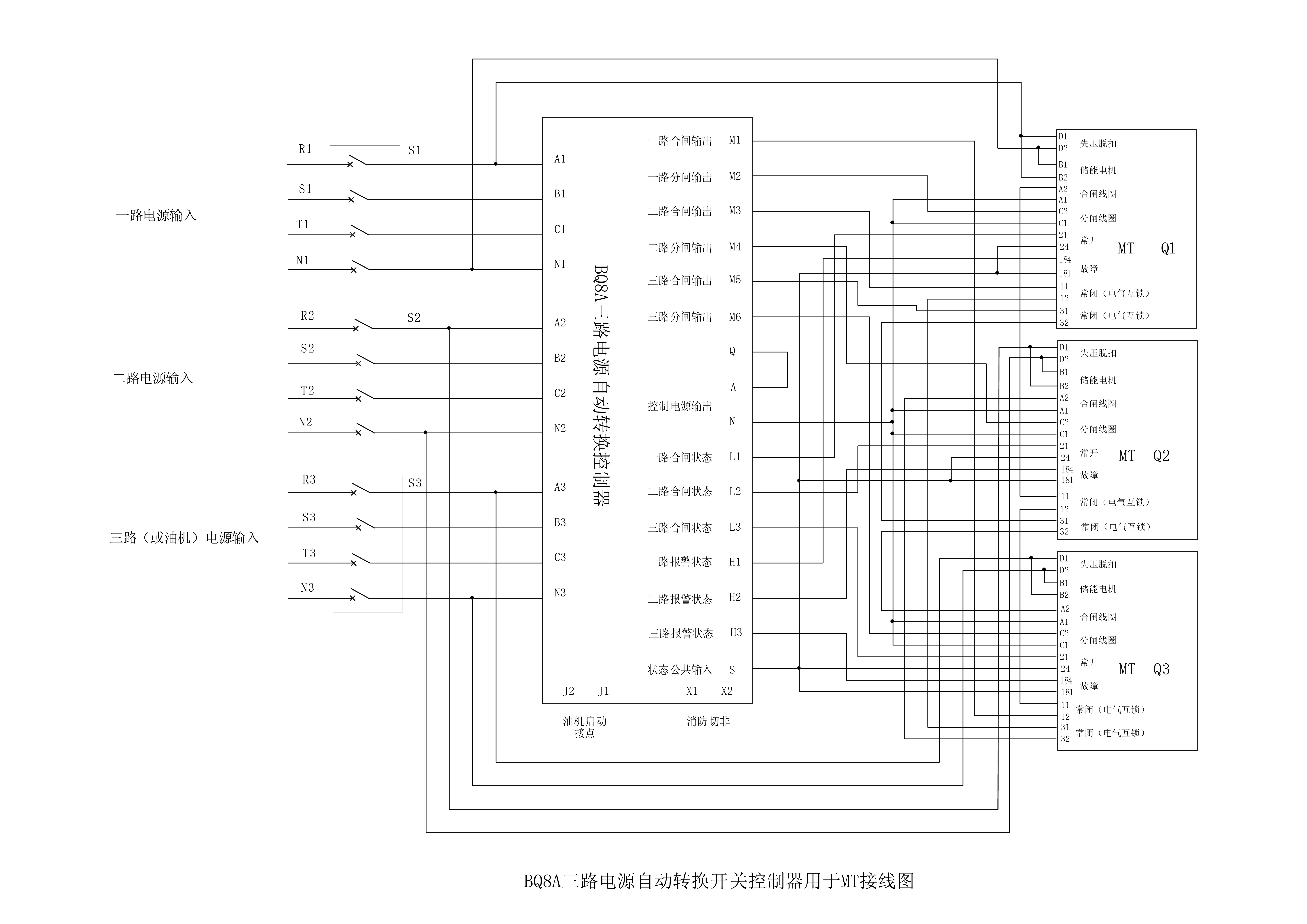 BQ8A三路(lu)(lu)電(dian)(dian)源(yuan)自(zi)動轉換(huan)開關控(kong)制器是一種(zhong)自(zi)動化測量、大屏(ping)幕LCD顯示為一體的智能(neng)三路(lu)(lu)電(dian)(dian)源(yuan)切換(huan)系統。是三路(lu)(lu)電(dian)(dian)源(yuan)自(zi)動切換(huan)的理想產品,在與低(di)壓(ya)空氣(qi)斷路(lu)(lu)器配(pei)套使用(yong)后,特別適合于三路(lu)(lu)低(di)壓(ya)進線側的自(zi)動轉換(huan)和保(bao)護。 產品具(ju)有結構緊(jin)湊(cou)、電路(lu)先進、接線簡單,可(ke)(ke)靠性高(gao),操作機構不管是(shi)塑殼(ke)斷(duan)路(lu)器,還是(shi)框架斷(duan)路(lu)器,還是(shi)CD2的(de)電操,都可(ke)(ke)與之配套。可(ke)(ke)廣泛應用于電力、石油(you)、化工、煤(mei)炭、冶金(jin)、鐵道、市政(zheng)、智能大廈等行業、部(bu)門的(de)電氣裝置、自動控(kong)制以及(ji)調試系統。 產品(pin)特點(dian) BQ8A自(zi)動(dong)轉換開關控(kong)制器(qi)(qi)的執行部(bu)件可(ke)以是框架式空氣斷路(lu)器(qi)(qi)也可(ke)以是塑殼斷路(lu)器(qi)(qi),三(san)臺斷路(lu)器(qi)(qi)不(bu)用加裝適配(pei)器(qi)(qi),也可(ke)以不(bu)需要(yao)(yao)欠(qian)壓脫扣(kou)器(qi)(qi),控(kong)制器(qi)(qi)不(bu)需要(yao)(yao)外接(jie)直(zhi)流電源,直(zhi)接(jie)對三(san)路(lu)供電狀態進行檢(jian)測,自(zi)動(dong)控(kong)制完成三(san)路(lu)電源的自(zi)動(dong)轉換。 技(ji)術特性 1.適用(yong)于三(san)路(lu)(lu)市電、兩(liang)(liang)路(lu)(lu)市電一路(lu)(lu)發電機或一路(lu)(lu)市電兩(liang)(liang)路(lu)(lu)發電機的(de)(de)三(san)路(lu)(lu)電源的(de)(de)自動轉換(huan)控制; 2.時刻監視三路三相電壓(ya)(ya)(ya),對出(chu)現的(de)電壓(ya)(ya)(ya)異常(如失壓(ya)(ya)(ya)、過壓(ya)(ya)(ya)、欠壓(ya)(ya)(ya)、缺相)做出(chu)準確的(de)判斷并輸出(chu)控制開(kai)關量(liang); 3.內(nei)部設有(you)控制(zhi)電(dian)(dian)源切換電(dian)(dian)路(lu),充(chong)分考(kao)慮(lv)了在各種操作機構的應用(如三個接觸器(qi),電(dian)(dian)動空開,框架斷路(lu)器(qi),CD2電(dian)(dian)操塑(su)殼斷路(lu)器(qi)等),還可作為(wei)ATS以及三選一(yi)工作電(dian)(dian)源使用;(三路(lu)只要其(qi)中一(yi)路(lu)電(dian)(dian)源正常,即有(you)控制(zhi)電(dian)(dian)源輸出(chu))。 4.設有自(zi)動(dong)(dong)/手動(dong)(dong)狀(zhuang)態切換(huan)功能,在手動(dong)(dong)方(fang)式下,可按(an)手動(dong)(dong)鍵實現開關分合閘(zha);自(zi)動(dong)(dong)狀(zhuang)態下,任何一路(lu)(lu)出(chu)現電壓異常時,開關自(zi)動(dong)(dong)切換(huan)到另一路(lu)(lu),在一路(lu)(lu)和(he)二路(lu)(lu)都(dou)異常時,自(zi)動(dong)(dong)啟動(dong)(dong)油(you)機發(fa)電,轉換(huan)到三路(lu)(lu)供(gong)電; 5.運行模式可設定為:自(zi)投自(zi)復(fu)(含一路(lu)(lu)優(you)先(xian)、二路(lu)(lu)優(you)先(xian))或自(zi)投不(bu)自(zi)復(fu):無優(you)先(xian)(互為備用); 6.數字顯示(shi)三路相電壓及線(xian)電壓及工作狀(zhuang)(zhuang)態,LED同時顯示(shi)三路合(he)閘(zha)及工作狀(zhuang)(zhuang)態; 7.可在(zai)控制器上更改(gai)設置參數(shu)(shu),均(jun)采用數(shu)(shu)字化調(diao)整(連(lian)續可調(diao));同時(shi)記憶在(zai)內部FLASH 存(cun)儲(chu)器內,在(zai)系統(tong)掉(diao)電時(shi)也不會丟(diu)失; 8.設有(you)電(dian)氣雙重聯鎖功能,始終保持只(zhi)有(you)其中的一路合閘; 9.具有自動啟動油(you)機功能(neng);控制器不(bu)需(xu)要外接直流供電電源,簡(jian)單方便; 10.三(san)路N線分離設計(ji); 11.具有(you)消(xiao)防(fang)切非(強(qiang)制分閘(zha))功能,以滿足緊急情(qing)況下(xia)的分閘(zha)。 12.具有極(ji)強的(de)抗電磁干擾能力,適合在(zai)強電磁干擾的(de)復雜(za)環境中使用; 13.控制(zhi)器可與任(ren)何低壓空氣斷(duan)路器及塑(su)殼斷(duan)路器配套,如DW45、DW17、DW15、ABB Emax、MT、3WL等。 14.模(mo)塊化結構(gou)設計,阻燃(ran)ABS塑(su)料外殼(ke),嵌入式安(an)(an)裝方(fang)(fang)式,插(cha)拔(ba)式接線端子,結構(gou)緊湊,安(an)(an)裝維(wei)護十分(fen)方(fang)(fang)便(bian)。 工作條件 1.電源: 交流輸入(ru):取自三路(lu)電(dian)(dian)(dian)源(yuan)中的其(qi)中一(yi)路(lu)A、N相(xiang)電(dian)(dian)(dian)壓,只要其(qi)中任何(he)一(yi)路(lu)有(you)電(dian)(dian)(dian),即可工作(zuo),單相(xiang)電(dian)(dian)(dian)壓>170V。(該系(xi)統要求接N) 交流(liu)輸入電壓范圍:0-279V(單相)╱0-482V(三相)50Hz 輸(shu)入(ru)三相電流(liu):0-1A(額定) 輸(shu)入(ru)功率:≤5W 2.繼電(dian)器輸出容量:5A 220VAC 工作原理 A1,B1,C1,N1:接一路電源(為市電) A2,B2,C2,N2:接二路電(dian)(dian)源(yuan)(默認市(shi)電(dian)(dian),也可為發電(dian)(dian)機) A3,B3,C3,N3:接三路(lu)電源(發(fa)電機) A、N:控制器(qi)輸(shu)出電(dian)(dian)源(yuan),以(yi)上三路電(dian)(dian)源(yuan)只要任何一(yi)路有電(dian)(dian)源(yuan)輸(shu)入,A、N就有AC220V電(dian)(dian)源(yuan)輸(shu)出, A為相線,N為零線 Q:控制器M1、M2、M3、M4、M5、M6內部無源公共接點,一般接A M1:一路合閘輸出 M2:一路分閘輸出(chu) M3:二路合閘(zha)輸出 M4:二路(lu)分閘輸出 M5:三路合閘輸出 M6:三路分閘輸(shu)出(chu) S:一二三路斷(duan)路器輔助及報警(jing)公共接點 L1:控制器(qi)一路合閘指示,接(jie)一路斷路器(qi)輔助常開 L2:控制器(qi)二(er)路(lu)(lu)合閘指示(shi),接二(er)路(lu)(lu)斷(duan)路(lu)(lu)器(qi)輔助(zhu)常開(kai) L3:控(kong)制器(qi)三路合(he)閘指示,接三路斷路器(qi)輔助常開 H1:控(kong)制(zhi)器一(yi)(yi)路(lu)報(bao)警(jing)指示(shi),接一(yi)(yi)路(lu)斷路(lu)器報(ba