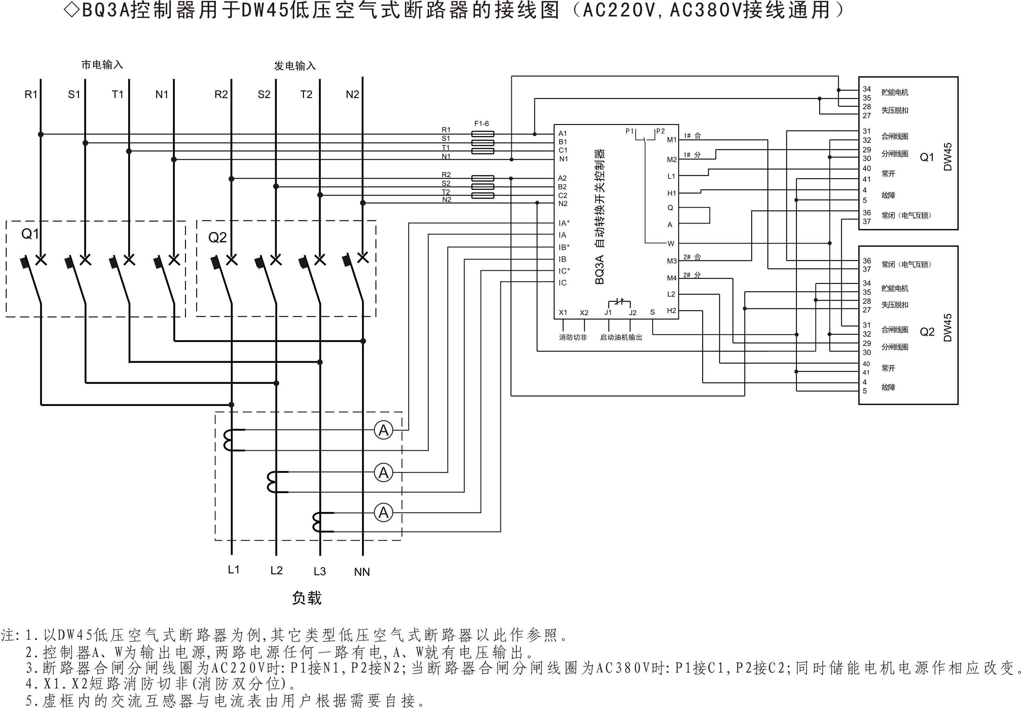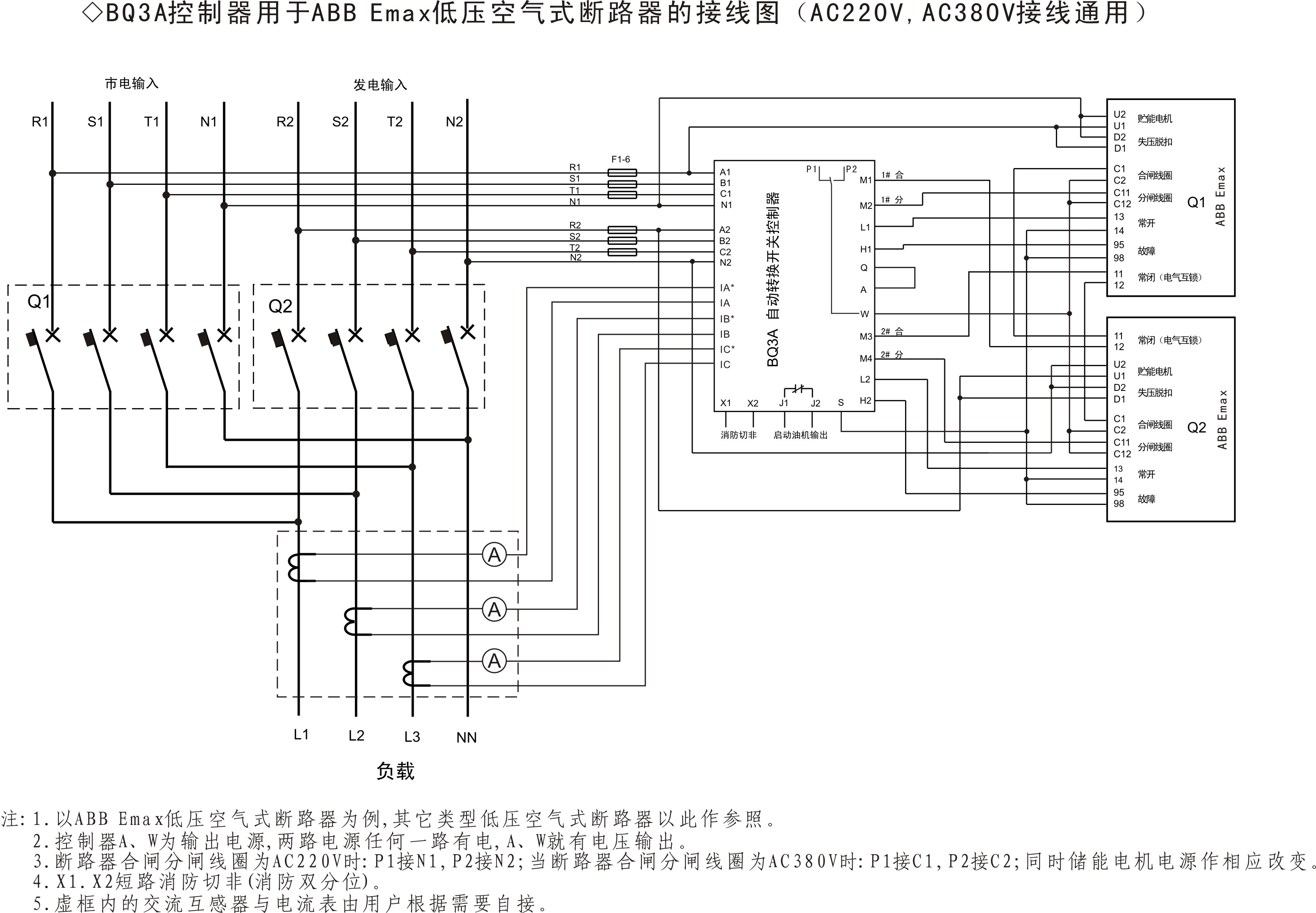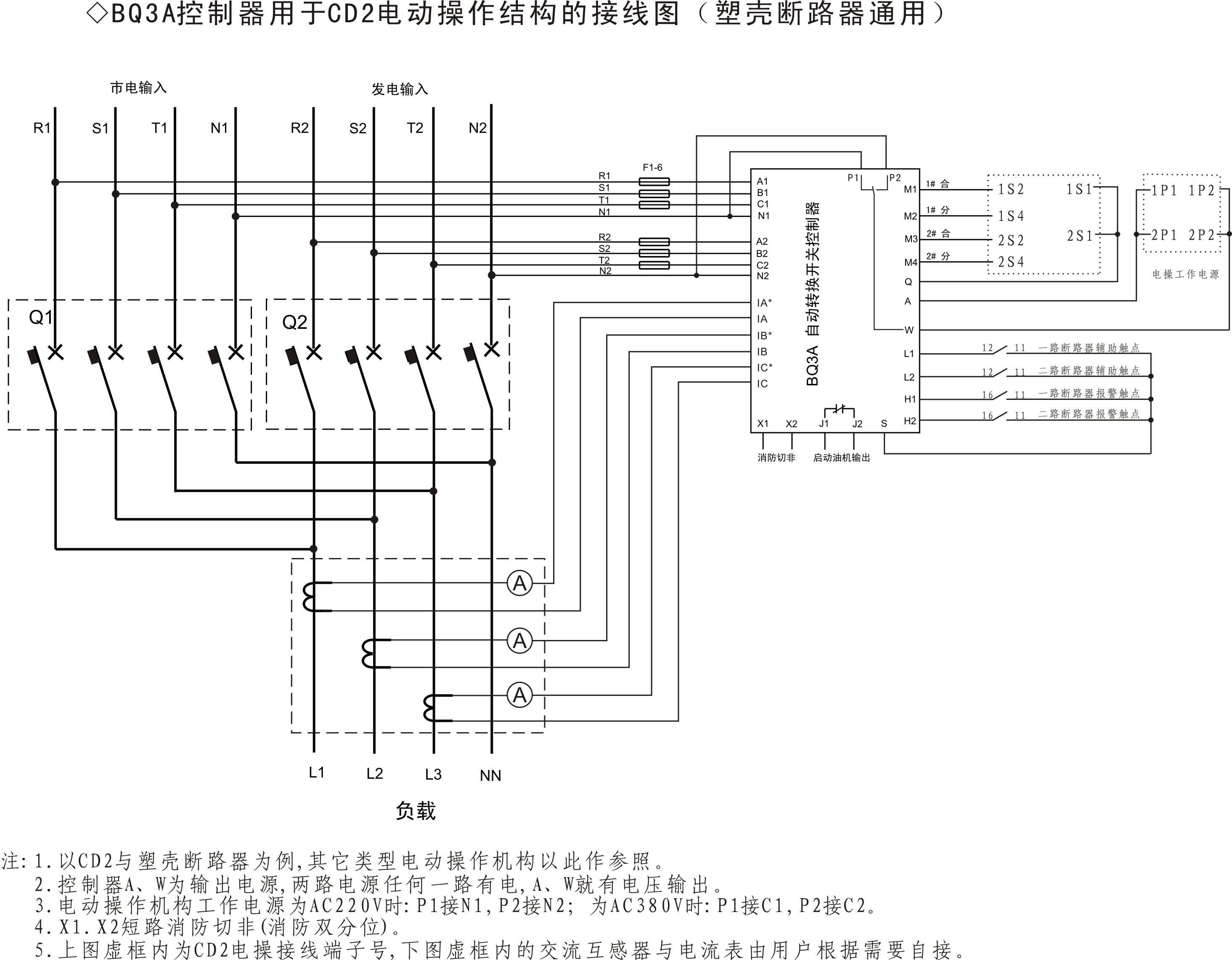 使用方法 A1,B1,C1,N1:接一路電(dian)源(默認(ren)市電(dian)) A2,B2,C2,N2:接(jie)二路電(dian)源(默(mo)認市(shi)電(dian),也可為發電(dian)機) A、W:控制器輸(shu)(shu)出(chu)電(dian)源(yuan),以上兩(liang)路(lu)電(dian)源(yuan)只(zhi)要任(ren)何一路(lu)有(you)電(dian)源(yuan)輸(shu)(shu)入(ru),A、W就有(you)電(dian)源(yuan)輸(shu)(shu)出(chu) P1 P2:斷路器合(he)閘(zha)分(fen)閘(zha)線(xian)圈電壓(ya)選(xuan)擇;當合(he)閘(zha)分(fen)閘(zha)線(xian)圈為AC220V時,P1接(jie)(jie)(jie)N1、P2接(jie)(jie)(jie)N2;當合(he)閘(zha)分(fen)閘(zha)線(xian)圈為AC380V時,P1接(jie)(jie)(jie)電源(yuan)(yuan)C1,P2接(jie)(jie)(jie)電源(yuan)(yuan)C2 Q:控制器M1、M2、M3、M4內部無(wu)源公共接點(dian),一(yi)般接A M1:一路合閘輸出 M2:一路分閘輸出 M3:二路合閘輸出 M4:二路分閘輸出 S:一二路斷路器輔助及報警公共接點 L1:控制(zhi)器一路(lu)合(he)閘指示,接一路(lu)斷路(lu)器輔(fu)助常開(kai) L2:控制器二路合閘指示,接二路斷路器輔助常(chang)開 H1:控制(zhi)器一路報(bao)警指示(shi),接一路斷路器報(bao)警常(chang)開 H2:控制器二路(lu)(lu)報(bao)警(jing)指示(shi),接二路(lu)(lu)斷路(lu)(lu)器報(bao)警(jing)常開 J1 J2:油機啟(qi)動輸出接點(dian),一路電源不正常(chang)時,會自動輸出啟(qi)動信號 X1 X2:消防切非(X1與X2短路斷路器全部分閘)