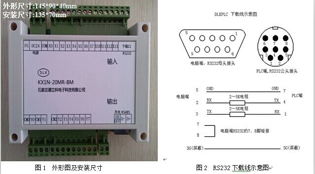 本產品可通過專用下載線與電腦連接(如圖2示),直接下載PLC程序,同時可以和具有RS232接口的文本屏、觸摸屏、RS485接口的變頻器等設備通訊。