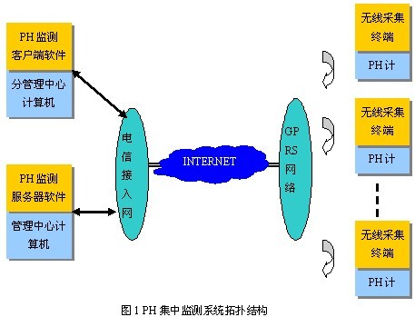 圖中的PH計放置在每個需要監測的監測點,每個PH計通過串口連接一個無線采集終端,采集終端通過GPRS無線上網,將數據通過INTERNET互聯網傳輸到管理中心。